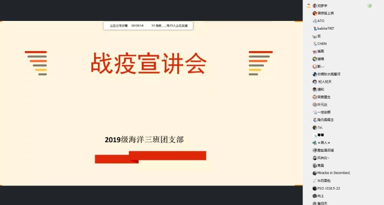 2020年5月23日20:00,河海大学2019级海洋科学三班团支部“绽放战疫青春”主题团日活动隆重举办。中国水电十三局医院党委委员王炳花院长、必赢线路检测中心团委书记安杰晶老师、本科生辅导员金颖、19级海洋三班学生参与此次活动。会议由团支书刘梦宇主持。