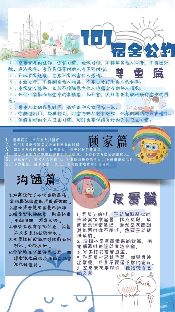 宿舍是我们的第二个家,宿舍文化是家风的传承,良好的宿舍文化对我们自身的成长、发展具有极其重要的影响,参与了此次活动后,各个宿舍成员们在此活动中收获了满满的乐趣,同时也共同进步,寻找到了独属于自己寝室的寝风,同样也希望同学们设计的宿舍公约能够真正地起到约束自己的作用,与海洋院的兄弟姐妹们共同建立一个温馨的大家庭!